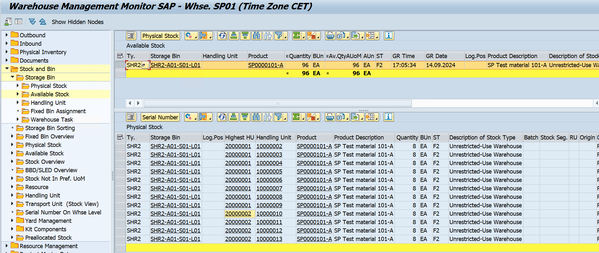 - In the example provided, there are 96 EA at the bin level for both highest level HU (20000001 - 64 EA & 20000002 - 32 EA)